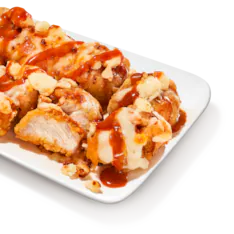 Tender bites of breaded chicken made with 100% whole breast white meat topped with sweet and smoky honey BBQ sauce,