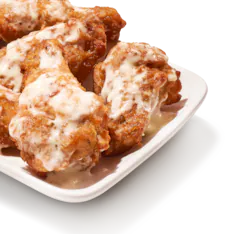 Tender bites of breaded chicken made with 100% whole breast white meat topped with garlic Parmesan sauce, a blend of