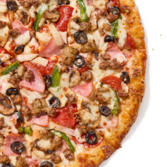 A flavorful combo of sweet tomato sauce, green peppers, onions, tomatoes, black olives, cheese, shredded Parmesan and cheesy garlic Hut